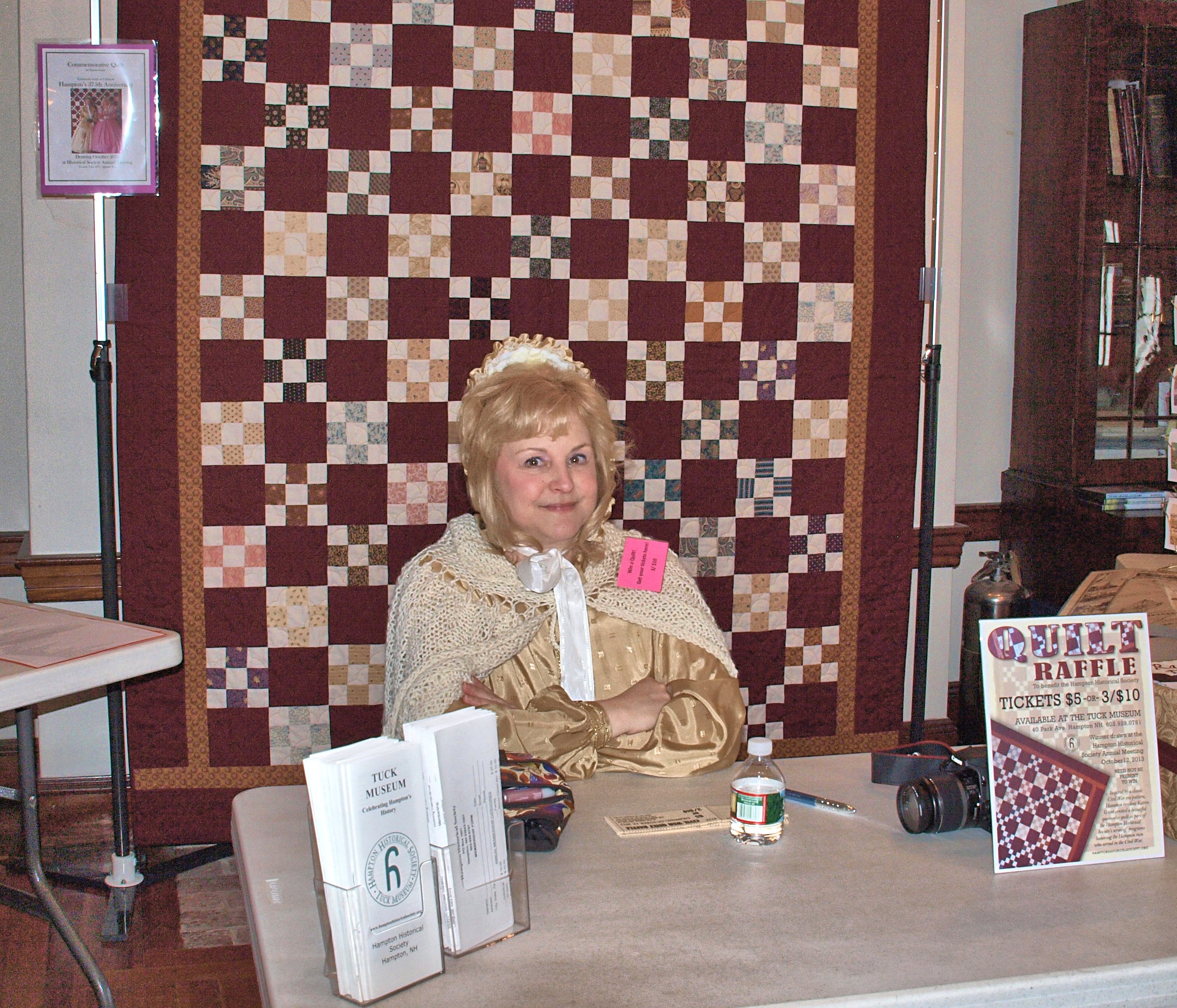 | Katrin Grant selling raffle tickets to the quilt she made (in the background). |