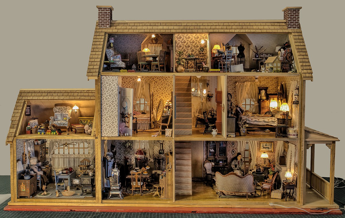 See below for a clickable view of the dollhouse, with high-resolution views of each room, which show the detail in the dollhouse.