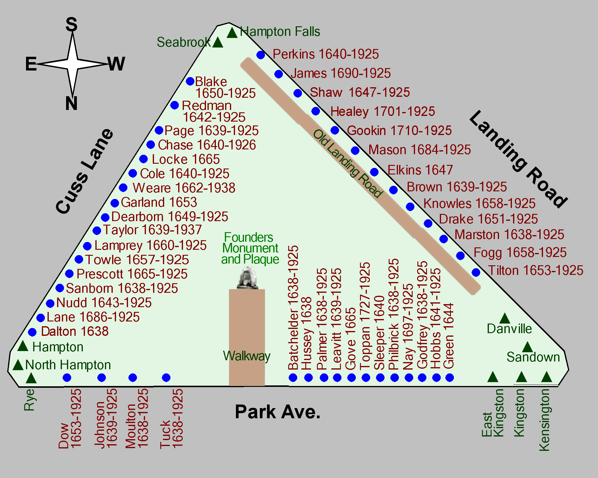 Stones representing the early families of Hampton are emplaced around the perimeter of the Park and now number 43. Generally, stones have been approved by the Hampton Historical Society for families who came to the area then constituting Hampton from 1638 to about 1695, which takes in the first four large groups to settle here. The town approves new stones after approval by the HHS.