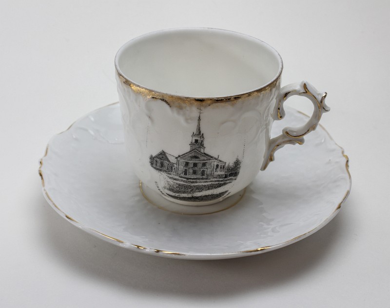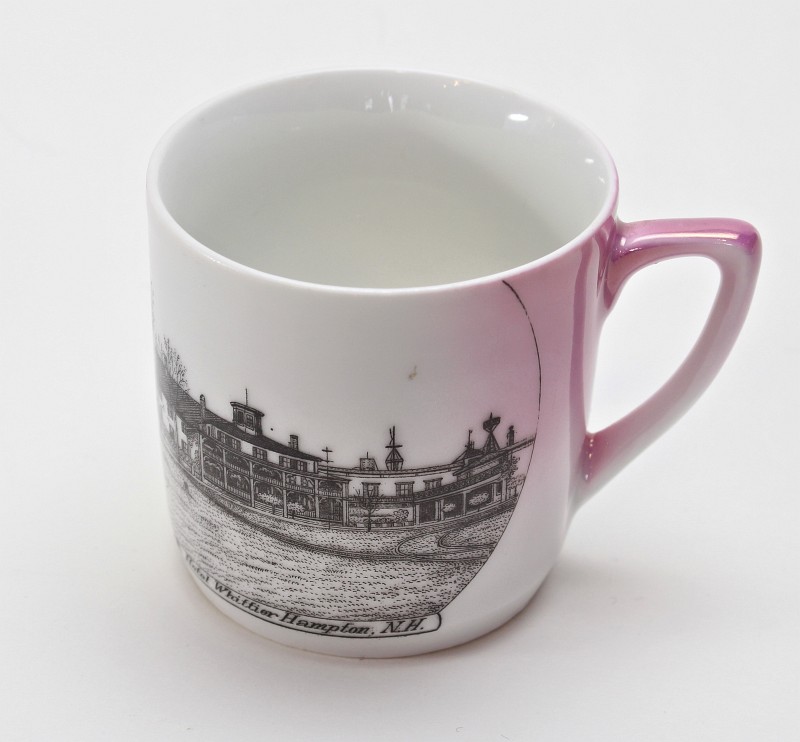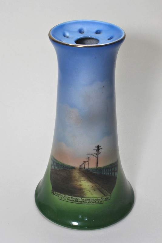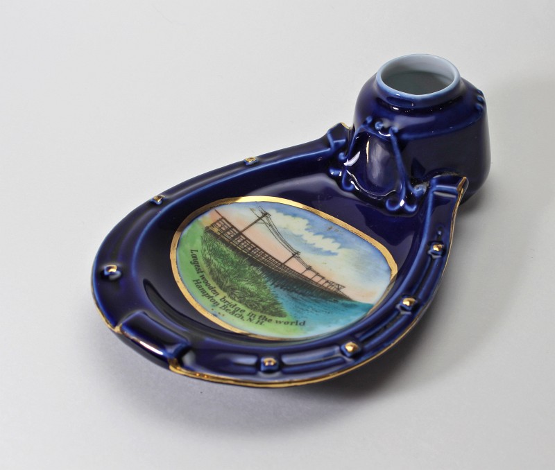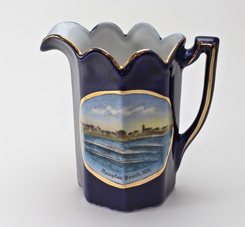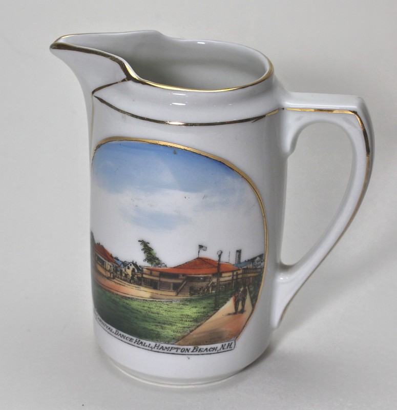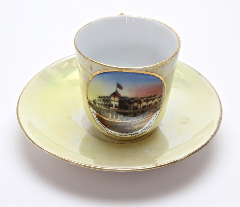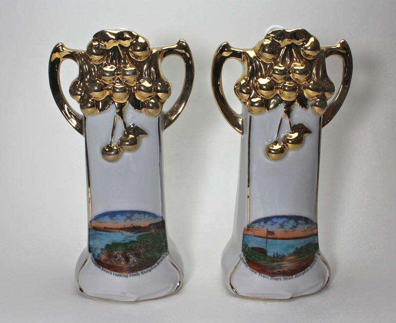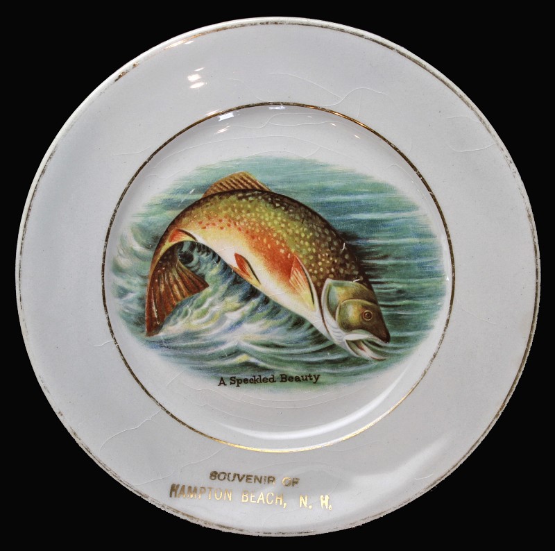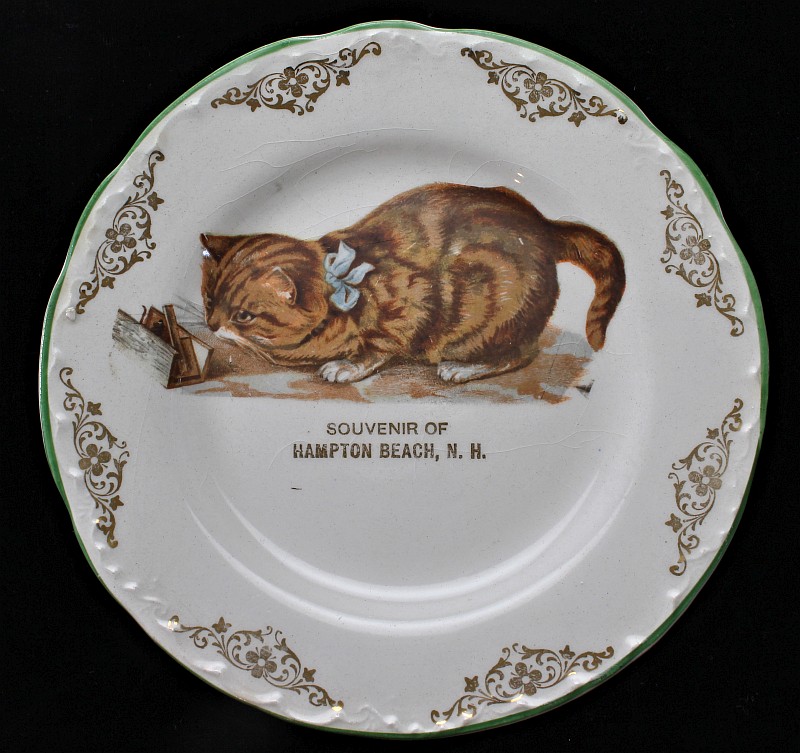 - two "Hampton Beach" plates - manufactured after WWI, their quality is not as fine as some of the other plates. These two plates (and the kitten plate on the top right) are more generic and therefore less expensive, because the design could be used for any town by just changing the name. Gold trim was added to the edges.
